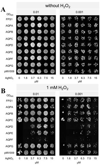 Phenotypic growth assay of S. cerevisiae strains expressing A. niger AQPs on AgNO3-containing agar media in the presence and absence of hydrogen peroxide. Overnight yeast cultures were diluted to an OD600 of 0.1, and subsequently, serial dilutions were done from this one. The 5 µL of cell suspensions were spotted on agar plates containing various AgNO3 concentrations (0–15 µM). Growth phenotype was recorded after incubating for 6 days at 30 °C. The data shown are representative of three independent experiments with consistent results. (A) No hydrogen peroxide added. (B) In the presence of 1 mM hydrogen peroxide.