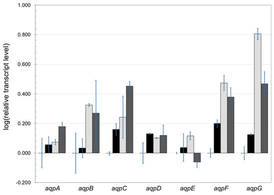 Expression of A. niger aqp genes under varying concentrations of hydrogen peroxide. Samples were taken 3 h after mycelium transfer to a medium containing various concentrations of hydrogen peroxide: from left to right: no hydrogen peroxide added, 2 mM (black), 10 mM (light gray), and 75 mM (dark gray) hydrogen peroxide. The expression analyses were performed by RT-qPCR. The transcript level of the histone-like gene was used to normalize transcript levels. Results are represented in relative transcript ratio in logarithmic scale (log10) with means of two biological replicates.