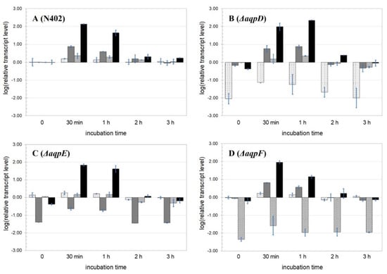 Expression analysis of A. niger wild-type and AQP knock-out strains under hydrogen peroxide-inducing conditions. Results of strain N402 (A), ΔaqpD (B), ΔaqpE (C), and ΔaqpF (D). Samples were taken before (0) or at various times after the addition of 10 mM hydrogen peroxide. The expression analyses were performed by RT–qPCR with primers specific for aqpD (white background filled with dots), aqpE (gray bar), aqpF (white background filled with stripes), and goxC (black). The goxC gene was used as a proxy for hydrogen peroxide uptake. The data presented is the mean of two biological replicates using a logarithmic scale (log10).