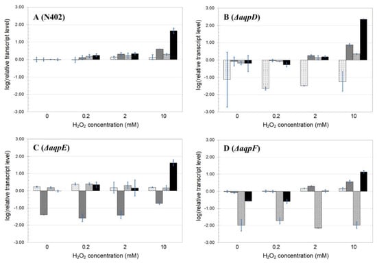 Single knock-out strains of aqpD, aqpE, and aqpF, actively facilitating hydrogen peroxide transport in yeast, were constructed. As hydrogen peroxide is both a reactive oxygen species known to cause damage to cellular components in high concentrations as well as a second messenger, we first analyzed AQP gene expression in the presence of various concentrations of hydrogen peroxide in the medium. Mycelium was incubated for 3 h with three different initial hydrogen peroxide concentrations. Fructose was used as a carbon source to avoid the generation of extracellular hydrogen peroxide by GOx. Upon the addition of hydrogen peroxide to the medium, the transcript levels of all AQP genes increased (Figure 5). As transcript levels of most AQP genes appeared to peak upon incubation with 10 mM hydrogen peroxide, a range of 0–10 mM hydrogen peroxide was chosen for transcriptional analysis of the AQP knock-out strains.