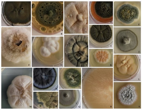 Macroscopic observations of some representatives of the fungal isolates obtained in this study on PDA medium: (A,I) Cladosporium allicinum. (B) Penicillium crustosum. (C,E,L,O) Aspergillus protuberus. (D) Stachybotrys chartarum. (F) Tapesia fusca. (G) Parengyodontium album. (H) Cladosporium cladosporioides. (J,Q) Cyphellophora olivacea. (K,M) Acremonium charticola. (N) Cladosporium sinuosum. (P) Penicillium brevicompactum. (R) Stereum hirsutum. (S) Filamentous Actinobacteria (fungus-like bacteria).