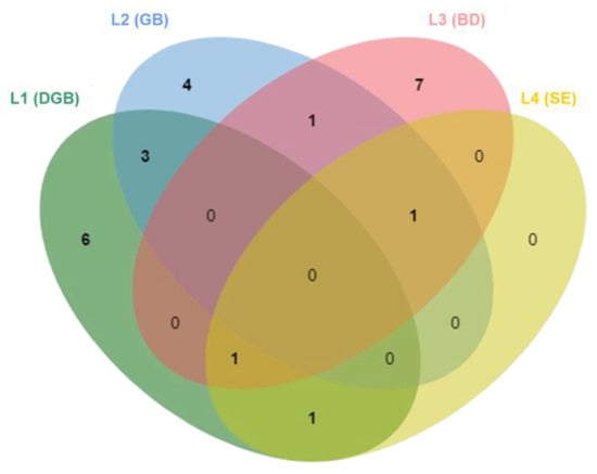 None of the isolated fungal species were found to be common across all four biodeterioration scenarios. Most of the species were found exclusively in one sample, with six species retrieved solely from L1 (DGB), four from L2 (GB), and seven from L3 (BD). Interestingly, L4 (SE) was the only sample without any exclusive species (Figure 2). It is plausible to suggest that this could be linked to the specific features of this sampling site, as sample L4 exhibited significant salt damage and these types of environments typically support a greater abundance of specialized organisms, which may not have the mechanisms to cope with the added stress of freezing temperatures. The L4 fresh sample contained two unique species, Aeminium ludgeri, a recently described xerophilic species, and a closely related unidentified isolate, which were not isolated after undergoing the freezing treatment. This suggests that these species may be sensitive to low temperatures or other stressors induced by the freezing process. Trovão et al. [63] have shown that A. ludgeri does not exhibit heat tolerance, and these results suggest that it may also be unable to tolerate cold and cannot survive extreme temperature variations.