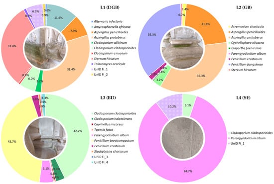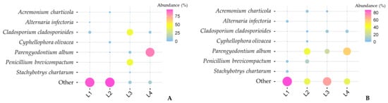 Figure 3 displays the overall abundance results at the species level for all four samples. In general, Ascomycota was the dominant phylum in all four samples. The most frequently retrieved isolates in sample L1 were Aspergillus protuberus (relative abundance of 31.4%), followed by Amycosphaerella africana (11.6%), Aspergillus penicillioides (7.9%), and Cladosporium cladosporioides (6%); in sample, L2 were A. Protuberus (35.3%), Penicillium jiangxiense (35.3%), and A. penicillioides (21.6%); in sample, L3 were C. cladosporioides and P. brevicompactum (42.7% for both); and sample L4 was highly dominated by Parengyodontium album, which solely accounted for almost 85% of the total abundance. The relative abundance of the other Ascomycota species was ≤5%.