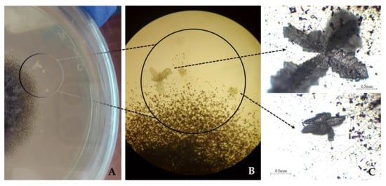 The appearance of the Aspergillus penicillioides colony on HM 10% medium, after maturation (gray mycelium), displaying precipitated crystals. (A) Direct visualization of the culture plate. (B) Observed under the light microscope (100×). (C) Observed under the light microscope (400×).