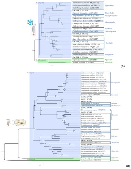 A maximum likelihood phylogenetic tree was constructed using rDNA-ITS sequences of one representative of each species previously identified based on morphological and taxonomic characteristics, to assess the diversity of cultivable fungi obtained from freezing incubation (Figure 5A) and compare it with that obtained from direct plating using fresh samples (Figure 5B).