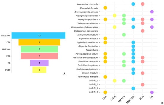 Differences in fungal isolates retrieved from the different culture media used for fungal isolation in this study. (A) The number of unique taxa isolated from each medium. (B) Overlap of cultivable species among the different culture media.