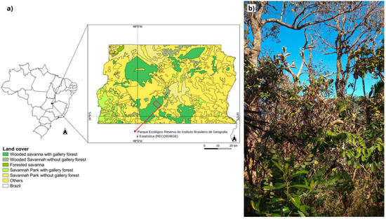 Figure 1. Sampling area. (a) Map of the Federal District of Brazil and land cover; (b) vegetation of the experimental area. Figure 1a was generated using QGIS Version 3.26.2 software.