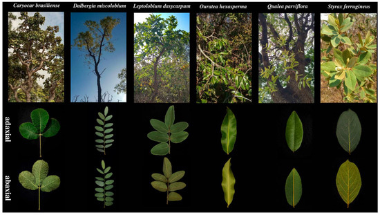 Plant material was collected at the end of the rainy season on 25, 26 and 30th March 2021. Six species of woody plants present in the control plots of the experimental area (Figure 1a), namely, Caryocar brasiliense, Dalbergia miscolobium, Leptolobium dasycarpum, Qualea parviflora, Ouratea hexasperma, and Styrax ferrugineus, were selected (Figure 2). Three individuals per species were sampled, and 20 healthy leaves without apparent symptoms of the disease were collected per individual, totaling 60 leaves per species. The collected samples were stored in sterile plastic bags, packed in thermos boxes with controlled temperatures, and transported to the laboratory where they were washed with neutral soap and running water [42]. After washing, the leaves were subjected to a superficial disinfection process and processed within 24 h.