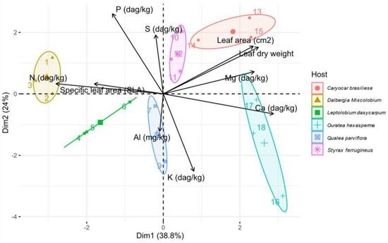 Figure 3. Principal Component Analysis (PCA) for detecting the correlations among the variables of leaf nutrient concentration, specific leaf area (SLA–cm2/g) and leaf area (cm2) from the six host plant species. Dim 1 (PC1) and Dim 2 (PC2) represent the x and y axes, respectively. The ellipses show biological replicas per host species. SLA: Specific Leaf Area; Al: Aluminum; Ca: Calcium; K: Potassium; Mg: Magnesium; P: Phosphorus; S: Sulfur. Figure created by R software version 4.1.1. using the package “ggplot2”.
