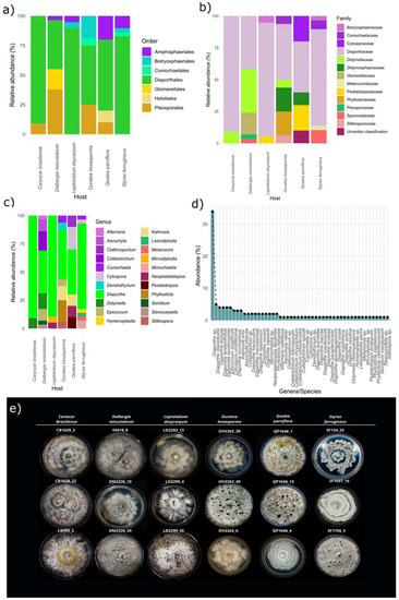Figure 4. Relative abundance at different taxonomic levels of cultivable endophytic fungi from six host species of the Brazilian Cerrado. (a) Relative abundance at order level, (b) family, and (c) genus. In (d), the relative abundance of the total isolates at genus and species level is shown. In (e), isolates of endophytic fungi belonging to the genus Diaporthe, and cultivated in PDA at 27 °C without lighting for 15 days are shown. The codes CB1629-2, CB995-3, DM18-8, DM2226-10, DM2226-29, LD2299-4, OH2262-30, OH2262-40, OH2262-6, QP1646-13, and SF1697-16 correspond to Diaporthe species unidentified. CB1629-22: Diaporthe schini; LD2293-13: Diaporthe stewartii; LD2299-35: Diaporthe macadamiae; QP1646-1: Diaporthe macintoshii; QP1646-4: Diaporthe inconspicua; SF134-25: Diaporthe foeniculina; SF1756-3: Diaporthe alicycle. Figures (ad) were created with R software version 4.1.1. using the package “ggplot2”.