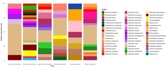 Figure 5. Species-level relative abundance (%) of the cultivable endophytic fungal community of six host species from the Brazilian Cerrado. Figure created with R software version 4.1.1. using the package “ggplot2”.