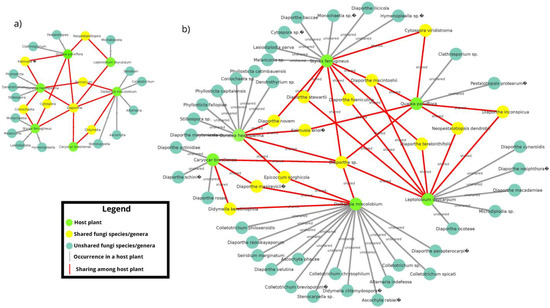 Figure 6. Architecture of the distribution network of endophytic fungi among six host plant species. (a) Distribution and sharing of fungi genera among host plant species; (b) distribution and sharing of genera and species is demonstrated. Light green nodes represent host plants; dark green nodes show fungal isolates (genus and/or species) not shared among host plants; and yellow nodes represent shared fungal isolates (genus and/or species) among host species. Gray lines indicate the occurrence of single taxa for specific hosts; red lines highlight species sharing. Figure created using the CYTOSCAPE version 3.9.1.