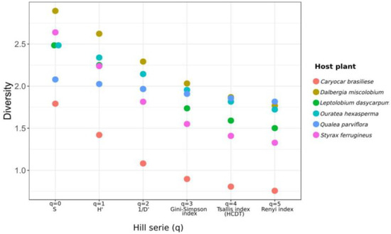 The community of cultivable endophytic fungi associated with the six species of host plants indicated variations among species diversity per host, as judged by alpha diversity metrics (Figure 7). The cultivable fungal community associated with D. miscolobium presented the highest values of alpha diversity for five out of six metrics shown by the Hill series (q), with indexes of species richness (S’) (q = 0), Shannon–Wiener (H’) (q = 1), Simpson’s dominance index (1/D) (q = 2), Gini–Simpson index (q = 3) and Tsallis index (HCDT) (q = 4). The cultivable fungal community present in O. hexasperma showed the highest equity (q = 5, Renyi index = 1.8161076). The lowest values of alpha diversity presented by the Hill series were observed in the host C. brasiliense.