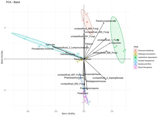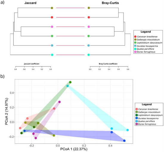 Figure 8. Beta diversity metrics of the endophytic fungi community isolated from six host plant species. In (a), dendrograms constructed from the Jaccard distance (binary presence/absence matrix) and Bray–Curtis (matrix of abundance) are shown. The bars between the dendrograms show similar clustering of communities for both metrics. In (b), the Principal Coordinate Analysis (PCoA) obtained from the Bray–Curtis distance matrix is shown. The percentage of variation explained by the plotted principal coordinates is indicated on X and Y axes. The colored circles indicate the grouping of the fungal communities of each host plant species. Figure created with R software version 4.1.1. using the package “ggplot2”.