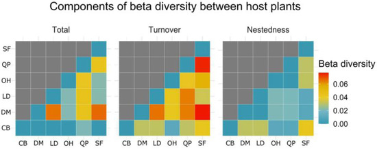 Figure 9. Heatmap showing the pairwise comparisons obtained using the Sorenson index and its components (total, turnover, nestedness) from the endophytic fungi community isolated from six host plant species. The X axis and Y axis show the host species analyzed. The value obtained for each of the components of the Sorensen index is presented on a color scale from blue (=minor) to red (=highest). CB: Caryocar brasiliense; DM: Dalbergia miscolobium; LD: Leptolobium dasycarpum; OH: Ouratea hexasperma; QP: Qualea parviflora; and SF: Styrax ferrugineus. Figure created with R software version 4.1.1. using the package “ggplot2”.