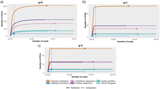 Figure 10. Rarefaction and extrapolation curves based on sample size (number of reads) of the foliar endophytic fungal community associated with six native woody species from the Brazilian Cerrado. (a) Species richness (Hill number for q = 0); (b) equally abundant species (Hill number for q = 1), and (c) dominance (Hill number for q = 2). Diversity curves were constructed using the number of rarefied reads (solid lines) and extrapolated (dashed horizontal lines) with estimates based on sample size. Each curve was extrapolated up to a doubling of its reference sample size. The vertically dashed black line shows the smallest sample size. Figure created with R software version 4.1.1. using the “iNEXT” package.