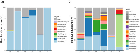 Figure 11. Relative abundance of the leaf endophytic fungal community associated with six Cerrado woody species. In (a), the relative abundance is shown at the phylum level, and in (b) at the order level. Sequences classified only at the kingdom level and/or in lesser abundance were grouped into “Others”. Cb: Caryocar brasiliense; Dm: Dalbergia miscolobium; Ld: Leptolobium dasycarpum; Oh: Ouratea hexasperma; Qp: Qualea parviflora; and Sf: Styrax ferrugineus.
