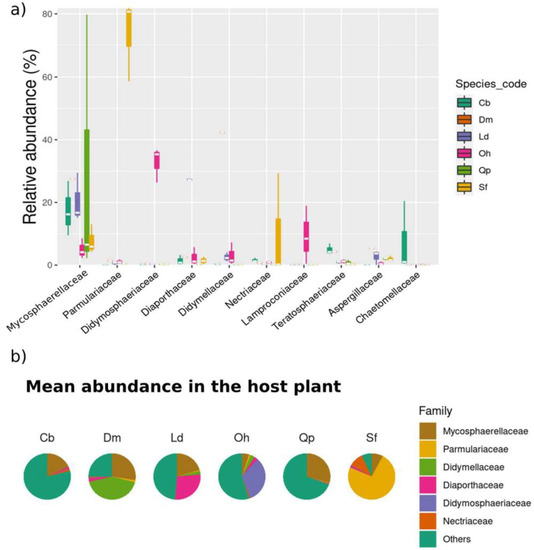 Figure 12. Taxonomic composition of the leaf endophytic fungal community of six host plant species at the family level. In (a), a comparison of the most abundant families among the different host plants is shown. In (b), the average of the most abundant fungal families in each host species is presented. Cb: Caryocar brasiliense; Dm: Dalbergia miscolobium; Ld: Leptolobium dasycarpum; Oh: Ouratea hexasperma; Qp: Qualea parviflora; and Sf: Styrax ferrugineus.