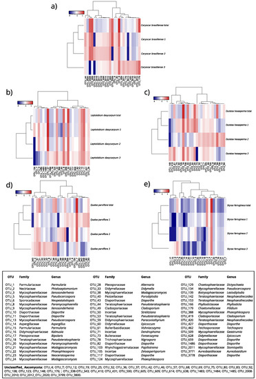 Figure 13. Heatmap representing the relative abundance of the 25 most abundant OTUs for each host plant at the genus level. Each heatmap represents a specific host, as follows: (a) C. brasiliense, (b) L. dasycarpum, (c) O. hexasperma, (d) Q. parviflora, and (e) S. ferrugineus. The lines are the sampling effort employed (three replicates per host) and the sum of the sampling effort (total). The columns show the 25 most abundant OTUs. The colors represent the relative abundance of each OTU: the redder the greater the abundance; the bluer the lower the abundance. To facilitate the data visualization, the number of readings, which is equivalent to the abundance, was represented on a logarithmic scale (base 10). Figures were plotted using the “Heatmap3” package implemented by R software version 4.1.1.