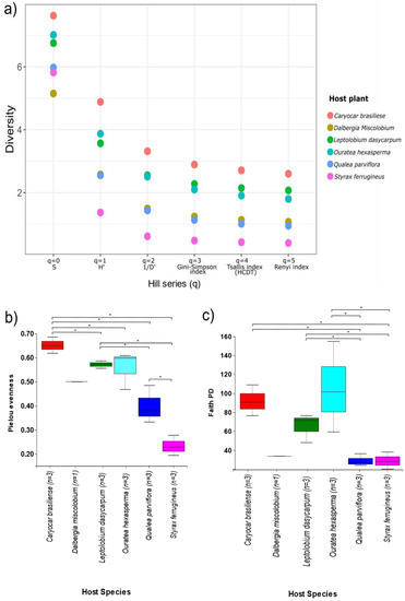 Figure 15. Alpha diversity indices of the community of endophytic fungi associated with six Cerrado native plant species. In (a), the Hill series is shown (q = 0, q = 1, q = 2, q = 3, q = 4, q = 5). The alpha diversity metric is displayed at the X axis. The Y axis shows the diversity values obtained over the X axis for each diversity metric employed. q = 0, species richness; q = 1, Shannon–Wiener index (H’); q = 2, Simpson dominance (1/D’); q = 3, Gini–Simpson index; q = 4, Tsallis index (HCDT); q = 5, Renyi index. In (b), Pielou’s equity is revealed. In (c), Faith’s phylogenetic diversity is demonstrated. The character “*” shows where statistically significant differences were found between the endophytic fungal community and the different host species (Kruskal–Wallis paired test, p < 0.05). The boxplots represent the inter-hip range (IQR) between the first and third quartiles (25th and 75th percentiles, respectively). The tails indicate the lowest and highest values found, and the middle horizontal lines inside the boxes are means. Figure created with R software version 4.1.1. using the “ggplot2” package.