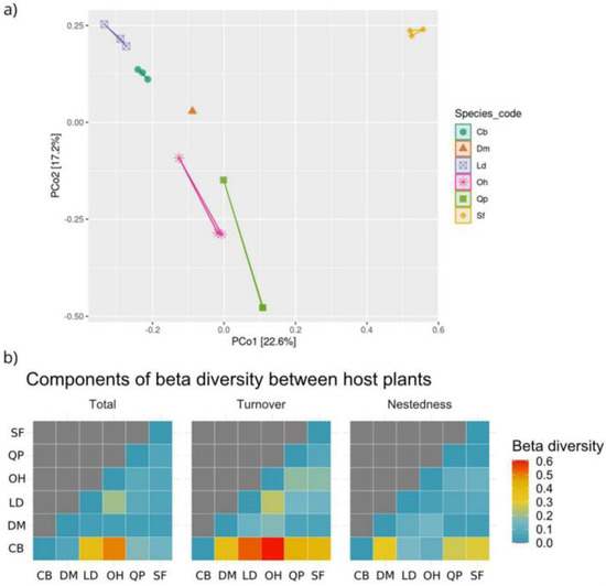 Figure 16. Metrics of beta diversity of the endophytic fungal community associated with six Cerrado woody plant species. In (a), Principal Coordinate Analysis (PCoA) derived from the Bray–Curtis distance is shown. The percentage of variation explained by the plotted principal coordinates is indicated at the X and Y axes. The colored symbols indicate the grouping of the fungal communities from each host plant species. In (b), the heatmap showing the paired comparisons obtained from the Sorenson index and its components (total, turnover, nestedness) of the community of endophytic fungi isolated from six plant species are shown. The X axis and the Y axis show the analyzed host species. The values obtained in each of the components of the Sorensen index are presented in a color scale: blue = minor; red = highest. CB: Caryocar brasiliense; DM: Dalbergia miscolobium; LD: Leptolobium dasycarpum; OH: Ouratea hexasperma; QP: Qualea parviflora, and SFf: Styrax ferrugineus. Figure created with R software version 4.1.1. using the “ggplot2” package.