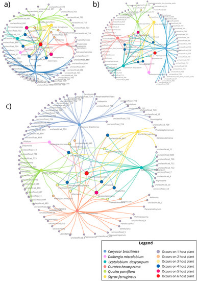 The influence of host species identity on richness, diversity, and the evenness of the leaf endophytic fungal community from six host plants was evaluated by different alpha diversity indices. The fungal community found in C. brasiliense presented the highest values in all ordinations shown by the Hill Series (q), including the indices that measure species richness (q = 0), diversity (q = 1), and those that give more weight for the most abundant species (q = 2, 3, 4, and 5) (Figure 15a). The second-highest values for the ordinations that measure species richness and diversity (q = 0, 1, respectively) were observed in O. hexasperma. The second-highest values for the indices that give more weight to dominant species were observed in L. dasycarpum. The lowest values for orders q = 1, 2, 3, 4, and 5 were observed in S. ferrugineus. Statistical differences shown by the Kruskal–Wallis Pairwise test (p < 0.05) were found by applying the Pielou evenness index, an index that measures the distribution of individuals between species, and in the phylogenetic diversity of Faith, an index that measures the species diversity. Species in a given niche based on the species number present and the phylogenetic differences among them are shown in Figure 15b,c.