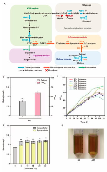 Figure 1. Overview of the retinol biosynthesis pathway and engineering strategy. (A) Retinol synthesis by S. cerevisiae includes endogenous mevalonate, central carbon metabolism, squalene synthesis, exogenous β-carotene synthesis, retinol modules, and overexpression of endogenous aldehyde dehydrogenase (ALD6), acetyl-CoA ligase (ACS1), ethanol dehydrogenase (ADH2), retinol dehydrogenase (ENV9), and NADH kinase (POS5), as well as exogenous GGPP synthase (CrtE) from Taxus × media, phytoene synthase (CrtB) from Pantoea agglomerans, phytoene desaturase (CrtI) from Blakeslea trispora, lycopene cyclase (CrtYB) from Xanthophyllomyces dendrorhous, β-carotene dioxygenase (Blh) from marine bacterium 66A03, retinol dehydrogenase Ybbo, knockout citrate synthase (CIT2), and malate synthase (MLS1). (B) Retinol production and OD600 of strain A01 fermented for 120 h. (C) The growth trend of strain A01 with different proportions of dodecane. (D) The retinol titer from strain A01 with different dodecane concentrations (** p < 0.01 according to one-way ANOVA, followed by Dunnett tests). (E) The color changes of strain S6 and A01 after 120 h of fermentation.