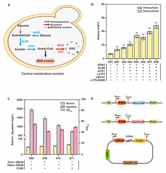Figure 2. Strengthening the central carbon metabolism module and weakening the competitive branch of squalene synthesis. (The number of plus signs represents the number of gene copies added, and the minus sign represents that no genetic manipulation) (A) Central carbon metabolism module pathway. (B) Overexpression of the key genes involved in central carbon metabolism affects retinol production (** p < 0.01). (C) Effect of replacing the natural promoter of ERG9 with HXT1 promoter or ERG1 promoter and adding degradation label CLN2 at the carbon end of ERG9 to reduce the expression of ERG9 on squalene and retinol production and OD600. (D) Strategies for weakening squalene synthesis (“up” refers to the upstream homologous arm; “down” refers to the downstream homologous arm).