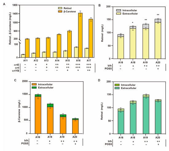 Figure 3. Changes in external β-carotene and retinol synthesis modules. (The number of plus signs represents the number of gene copies added, and the minus sign represents that no genetic manipulation) (A) The effect of increasing the copy numbers of the key genes crtE, crtI, and crtYB in the β-carotene biosynthesis pathway on intracellular β-carotene and extracellular retinol production. Effect of overexpression of the retinol biosynthesis pathway genes blh and POS5 on (B) retinol titer (* p < 0.05, ** p < 0.01 according to one-way ANOVA, followed by Dunnett tests), (C) precursor β-carotene production, and (D) retinal production (the number of plus signs represents increased gene copies).