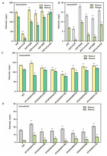 Figure 4. Knockout of ABC transporter inhibits retinol efflux and increases retinol production. (A) Addition of ABC transporter inhibitor to verify the effect of ABC transporter on retinoid production at extracellular level. (B) Addition of ABC transporter inhibitor to verify the effect of ABC transporter on intracellular retinoid production. (C) Effect of knockout of ABC transporter on retinoid production at extracellular level. (D) Effect of knockout of ABC transporter on intracellular retinoid production (* p < 0.05, ** p < 0.01 according to one-way ANOVA, followed by Dunnett tests).