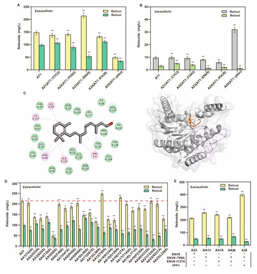 Figure 5. Mining and modification of retinol dehydrogenase to increase retinol production. Effect of different retinol dehydrogenases on (A) retinoid production at extracellular level and (B) intracellular retinoid production. (C) Molecular docking of ENV9 binding to retinal. The left panel represents the key site for molecular docking prediction, the right panel represents the docking of substrate with protein, the gray panel represents protein ENV9, and the orange panel represents substrate retinal. (D) Retinoid production at extracellular level change after mutation of key sites on ENV9 (The red dotted line represents the retinol titer of control strain A23). (E) Effect of multiple expression of key retinol dehydrogenase on retinoid production at extracellular level (The number of plus signs represents the number of gene copies added, and the minus sign represents that no genetic manipulation; * p < 0.05, ** p < 0.01 according to one-way ANOVA, followed by Dunnett tests).