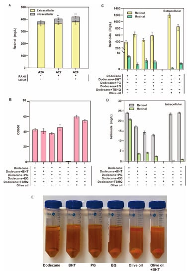 In summary, the use of dodecane with antioxidant or olive oil alone for extraction has unique advantages. We combined olive oil and dodecane at a ratio of 1:1 to extract retinol, and the retinol yield reached 849 mg/L. We also observed apparent color differences using the two extraction methods. The color of the olive oil extract supernatant was darker, indicating that it contained more retinol (Figure 6E). The results showed that the effect of extracting olive oil alone was the best, better than that of olive oil and dodecane compound extraction with BHT, while the effect of adding BHT in dodecane was the worst.