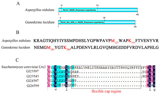 Bioinformatics analysis of NmrA in G. lucidum and A. nidulans, and Ure2 in G. lucidum and S. cerevisiae. (A) Conserved domain analysis of NmrA in A. nidulans and G. lucidum. (B) Determination of the Met-X-X-X-Lys structure in A. nidulans and G. lucidum. (C) Location analysis of the Ure2 “Flexible Cap Region” of S. cerevisiae and G. lucidum.