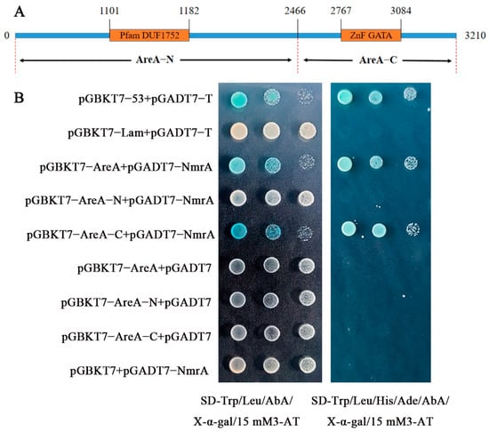 The yeast two-hybrid method was used to verify the interaction between AreA and NmrA. (A) The sequences of AreA were divided into two parts for the yeast two-hybrid assay. (B) pGBKT7-areA, pGBKT7-areA-N, or pGBKT7-areA-C was co-transformed with the pGADT7-nmrA into the Y2H strain. The Y2H strain containing the target carrier was cultured on an SD-Trp/Leu auxotrophic medium and an SD-Trp/Leu/His/Ade auxotrophic medium with 20 ng/mL of X-α-gal, 15 mM 3-AT, and 125 ng/mL AbA and then the media were incubated at 30 °C for 2 days to assess the protein–protein interactions. The strain with pGBKT7-53 and pGADT7-T was used as the positive control. The strain with pGBKT7-Lam and pGADT7-T was used as the negative control.