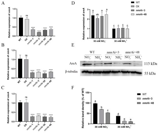 Effect of NmrA on AreA protein content. (A) Construction of the nmrA silenced strains. The strains were cultured on a CYM containing 100 μg/mL of hygromycin B at 28 °C for 5 days. The silencing efficiency of nmrA was identified by RT-qPCR. (B) The silencing efficiencies of nmrA of all strains were detected under the ammonium condition. (C) The silencing efficiencies of nmrA for all strains were detected under the nitrate condition. (D) The expression levels of areA in the WT and nmrA silenced strains were detected under the ammonium or nitrate conditions. (E) Western blot was used to detect the protein content of AreA in the WT and nmrA silenced strains. The WT and nmrA silenced strains were cultured in ammonium or nitrate at 28 °C for 5 days, and then the mycelia were collected for protein extraction. (F) The protein level was quantitatively analyzed using Image J v1.8.0 software. All data are presented as means SDs (n = 3). Asterisks indicate significant differences compared with the WT strain (one-way ANOVA, **** p < 0.0001, ns: no significance). Different letters indicate significant differences among groups (p < 0.05).