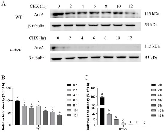 The effect of nmrA on the stability of the AreA protein. (A) The AreA protein levels of the WT and nmrA silenced strains were detected by Western blot. The WT and nmrA silenced strains were cultured on CYM and pretreated with cycloheximide (CHX) for 0 to 12 h. (B,C) The graphs show the relative band intensity of the AreA after different CHX treatments for the WT and nmrA silenced strains, respectively. Different letters indicate significant differences among groups (p < 0.05).