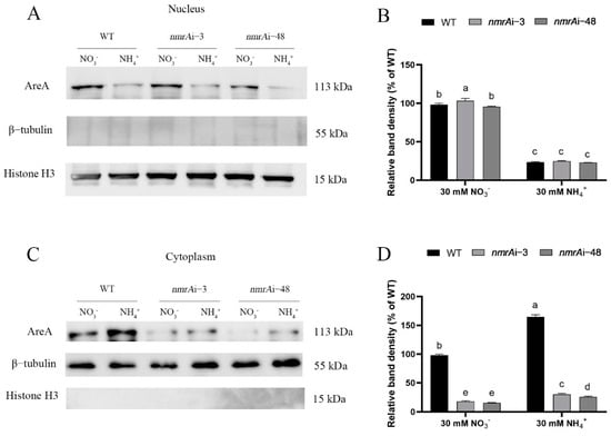 As a key transcription factor responsible for regulating nitrogen metabolism, AreA enters the nucleus and regulates the expression of its downstream-related genes [20,43,44,45]. Therefore, the contents of AreA in the nucleus were detected under the ammonium or nitrate condition. As shown in Figure 5A,B, the content of AreA protein in the nuclei of the WT strain was increased 4.16-fold under the nitrate condition compared with that under the ammonium condition. The contents of the AreA protein in the nucleus of the nmrAi-3 and nmrAi-48 strains showed no significant changes compared with that of the WT, no matter the conditions (ammonium salt or nitrate) (Figure 5A,B). However, the content of the AreA protein in the cytoplasm of the WT, nmrAi-3, and nmrAi-48 strains was increased under the ammonium condition compared with those under the condition of nitrates (Figure 5C,D). These results suggest that although silencing of nmrA decreased the intracellular AreA content, it did not affect the AreA content of the nuclei.