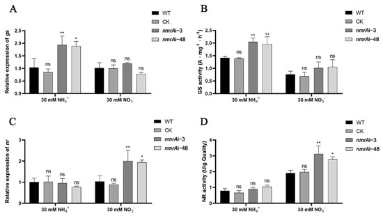AreA can activate the expression of the glutamine synthase gene (gs) and the nitrate reductase gene (nr) by binding to their promoter regions in G. lucidum [32]. Therefore, we examined these gene expressions and enzyme activities. As shown in Figure 6A,B, compared with the WT, the expression of gs in nmrAi-3 and nmrAi-48 was increased by approximately 94% and 88%, respectively, and the enzyme activity was also increased by approximately 65% and 40%, respectively, under the ammonium condition (Figure 6B). However, compared with the WT, there were no significant changes in the expression level of gs or the enzyme activity of glutamine synthase under the nitrate condition. The expression and enzyme activity of nr showed different results from those of gs. Compared with the WT, the expression level or enzyme activity of nitrate reductase of nmrAi-3 and nmrAi-48 did not change significantly under the ammonium condition. However, under the nitrate condition, the expression of nr in nmrAi-3 and nmrAi-48 strains was increased by approximately 100% and 93%, respectively, and the activity of NR increased by approximately 64% and 45%, respectively (Figure 6C,D). These results indicate that silencing of nmrA influenced the expression levels of gs and nr.