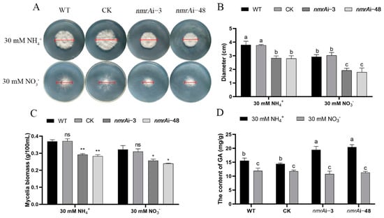 The effect of NmrA on mycelial growth and ganoderic acid biosynthesis. (A) The growth of the WT, CK, and nmrA silenced strains under the ammonium or nitrate conditions. All strains were photographed after 5 days of growth at 28 °C. (B) The diameters of the WT, CK, and nmrA silenced strains under the ammonium or nitrate conditions. (C) The mycelial biomasses of the WT, CK, and nmrA silenced strains under the ammonium or nitrate conditions. The WT, CK, and nmrA silenced strains were cultured in a CYM liquid medium for 3 days and then transferred to a liquid medium containing 30 mM of ammonium or 30 of mM nitrate for 5 days. Samples were then collected for detection. (D) The GA contents of the WT, CK, and nmrA silenced strains under the ammonium or nitrate conditions. All data are presented as means SDs (n = 3). Asterisks indicate significant differences compared with the WT strain (one-way ANOVA, * p < 0.05, ** p < 0.01, ns: no significance). Different letters indicate significant differences among groups (p < 0.05).