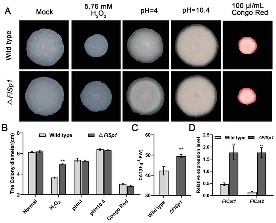 To investigate the biological function of FlSp1, we obtained a gene mutant of FlSp1 using a homologous recombination strategy (Figure S1). Phenotypic analysis revealed no significant difference in the growth of the wild type (WT) and the FlSp1 mutant (ΔFlSp1) in normal basal medium (Figure 1A). Additionally, the knockout of Flsp1 did not affect the growth of the strain under acid-base conditions (pH = 4 and pH = 10.4) and cytostatic (Congo red) conditions. However, under oxidative stress (H2O2) conditions, the knockout of Flsp1 resulted in a significant increase in fungal tolerance to oxidative (Figure 1A,B) with relative inhibition rates of 18% (p < 0.01). Further analysis revealed that the knockout of Flsp1 resulted in a significant elevation (~1.25 fold) of peroxidase (CAT) activity in the strain in comparison with WT (p < 0.01) (Figure 1C). The analysis of transcriptional patterns revealed that the disruption of Flsp1 caused the significant up-regulation (~3.6- and 9.1-fold) of the expression of CAT synthesis-related genes—Flcat1 and Flcat2 (p < 0.01) (Figure 1D). This suggests that Flsp1 negatively mediates the oxidative stress responses in F. lateritium.