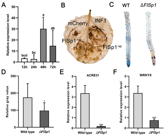 FlSp1 stimulates the plant immune system and accumulates ROS. (A) Expression pattern analysis of FlSp1. FlSp1 is highly expressed in the early stages of interaction. Separate one-way ANOVAs were used for each group, followed by pairwise comparisons at different time points using Tukey’s HSD method with different lowercase letters indicating significant differences in pairwise comparisons (p < 0.05). (B) FlSp1−sp and FlSp1−sp cause ROS accumulation in plant leaves. INF1 was used as a positive control. (C) ΔFlSp1 caused lower ROS burst in plant roots than in wild type. (D) Roots were stained for NBT and then examined for grey values using ImageJ. (E,F) Wild type and ΔFlSp1 were detected for the relative expression of defense-related genes after 1 d of co-culturing with N. benthamiana. Each experiment was repeated three times; * indicates significant difference (p < 0.05) and *** indicates extremely significant difference (p < 0.001).