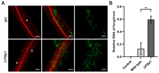 Knockout of FlSp1 increases fungal colonization. (A) The mycelium was stained after 2 d of co-culturing and was photographed at 488 mM. n indicates plant cell nuclei. (B) After 2 d of co-culturing, the levels of wild types and mutant DNA were examined in the root system of the plant. Each experiment was repeated three times; ** indicates highly significant differences (p < 0.01).