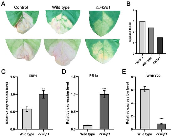 FlSp1 negatively mediates the resistance of tobacco to R. solanacearum. (A) The ΔFlSp1 group had a significantly lower index of disease. (B) Disease index for each treatment group. (C–E) After root irrigation treatment, detection of expression of defense-related genes 2 d after the R. solanacearum injection. Each experiment was repeated three times; ** indicates significant difference (p < 0.01) and *** indicates a highly significant difference (p < 0.001).