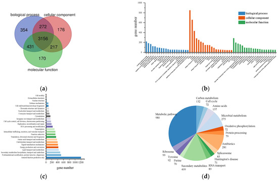 The genome of L. iranensis DWH-2 was assembled using sequencing data generated by the Illumina platform (Table S2). The characteristics of the L. iranensis DWH-2 genome are summarized in Table 1. Approximately 31.5 million Illumina read pairs or about 220× coverage of the genome was assembled, generating a genome sequence of 43.01 Mb comprising 78 scaffolds with N50 lengths of 1.08 Mb. The assembled genome accounted for 98.4% of the reference genome (43.69 Mb) of the genus Lasiodiplodia currently available on the NCBI. In addition, the overall GC content of the L. iranensis DWH-2 genome was approximately 54.82%, and 11,224 coding genes were predicted, among which 4776 (45.2%) genes were assigned, as revealed by the GO annotation system. The distribution of these predicted genes included 4213, 3821, and 3974 genes in the biological process, cellular component, and molecular function, respectively, all of which were relatively uniform and presented cross-overlap in the three categories (Figure 1a,b). Among the Biological Process GO terms, “oxidation–reduction process” occupied the highest percentage (4.54%), followed by “transmembrane transport” (3.85%), “regulation of transcription, DNA-templated” (3.50%), and “transcription, DNA-templated” (2.55%). The most-annotated Cellular Component GO term was “nucleus” (17.78%), followed by “cytosol” (13.78%) and “cytoplasm” (9.02%). “Zinc ion binding” was the most-enriched Molecular Function GO term (5.95%), followed by “ATP binding” (4.08%) and “DNA binding” (3.69%). A total of 6036 (53%) genes were assigned to the KOG database, whereas 7351 (65.5%) genes were assigned to the Swiss-Prot database, which included the highest number of annotated genes. The KOG annotation showed that the major function group was “general function prediction only” containing 1198 genes (Figure 1c). A total of 2345 (20.9%) genes were mapped to 364 pathways in the KEGG database. The top 15 pathways with the highest number of genes annotated are presented in Figure 1d. Among these pathways, the metabolic pathway contained the highest number of genes (980 genes), followed by the biosynthesis of secondary metabolites (409 genes).