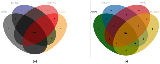 (a) Comparison of the PHI-base homologs in the genomes of L. iranensis M2017288 and L. theobromae AM2As, L. theobromae CSS_01s, and L. theobromae LA_SOL3 using OrthoVenn2. (b) Comparison of CAZymes in the genomes of L. iranensis M2017288 and L. theobromae AM2As, L. theobromae CSS_01s, and L. theobromae LA_SOL3.