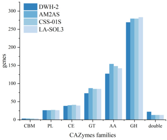 CAZy functional classification and number of corresponding genes in L. iranensis DWH-2, L. theobromae AM2As, L. theobromae CSS_01s, and L. theobromae LA_SOL3. CBM, carbohydrate-binding module; PL, polysaccharide lyase; CE, carbohydrate esterase; GT, glycosyltransferase; AA, auxiliary activity; GH, glycoside hydrolase; double, genes containing two domains belonging to different gene families.