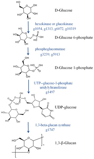 1,3-β-Glucan synthesis pathway. Genes encoding related enzymes are marked on the side of the arrow.