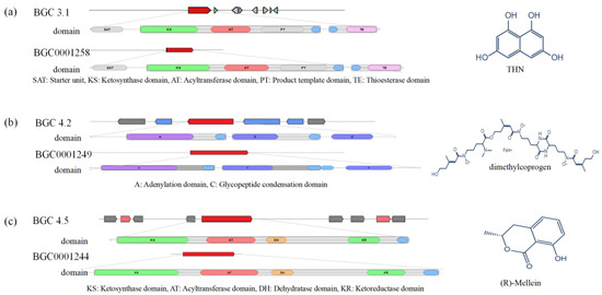 Comparison of BGCs constituents in L. iranensis with the identified BGCs involved in the biosynthesis of (a) THN, (b) dimethylcoprogen, and (c) (R)-melanin.