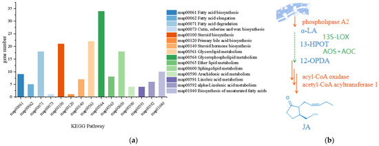 (a) Distribution map of lipid metabolism pathways in L. iranensis. (b) Genes and metabolites involved in the JA synthesis route. Annotated genes were in the orange mark, unannotated genes were in the green mark, and metabolites were in the blue mark.