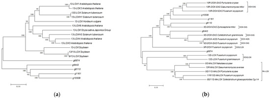 Phylogenetic tree of the mined lipoxygenases aligned with (a) 13-LOX in plants and (b) fungal dioxygenases.